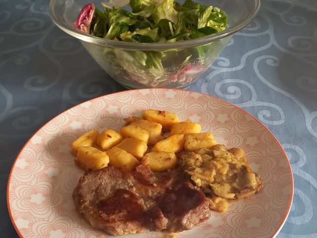 Paradižnikova juhica z rizoni; pečena vratovina, jurčkova omaka, njoki; motovilec, endivija s fižolom in ocvirki; marmeladni kifeljčki