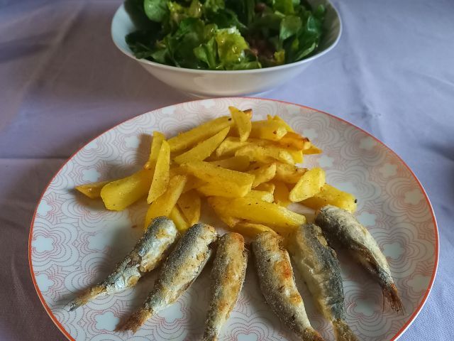 Ostanki čorbice od včeraj; pomfri, pečene sardelice; motovilec, endivija s fižolom