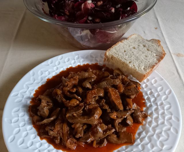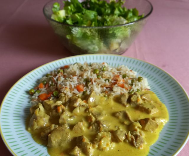 Rizi-bizi, telečje nakockano v omaki s kurkumo; endivija s krompirjem