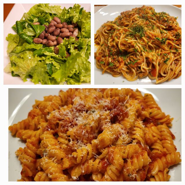 svedrčki s paradižnikovo omako, špageti z zelenjavno omako, solata