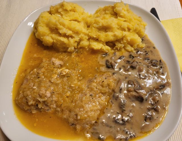 Zrezki v omaki, gobova omaka, pražen krompir, solata