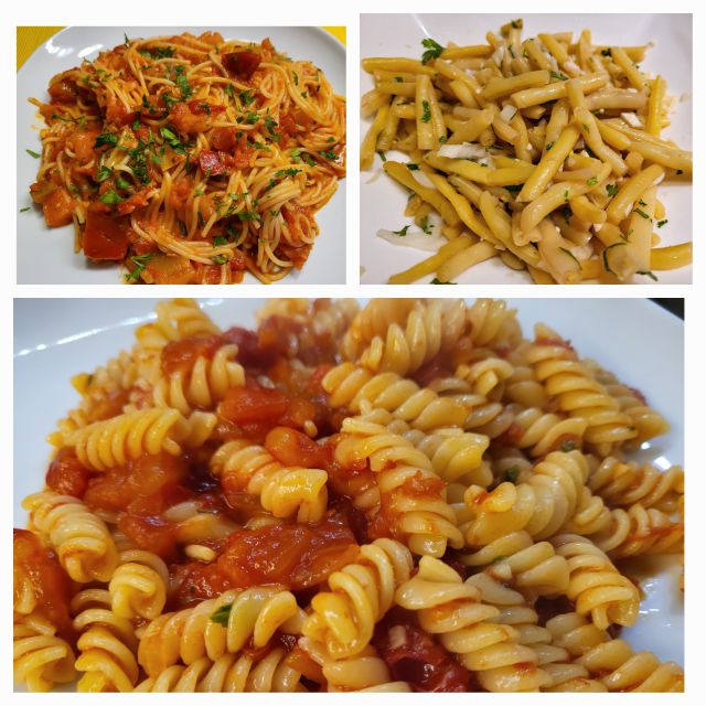 špageti z zelenjavno omako, svedrčki s paradižnikovo omako, stročji fižol v solati