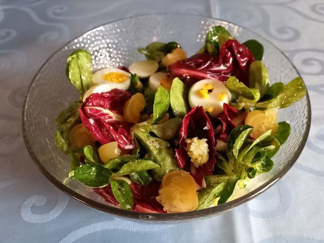 Gobova juha, pečen piščanec, pire krompir, solata, karamelizirane palačinke z nadevom iz sliv (iz skrinje), kava