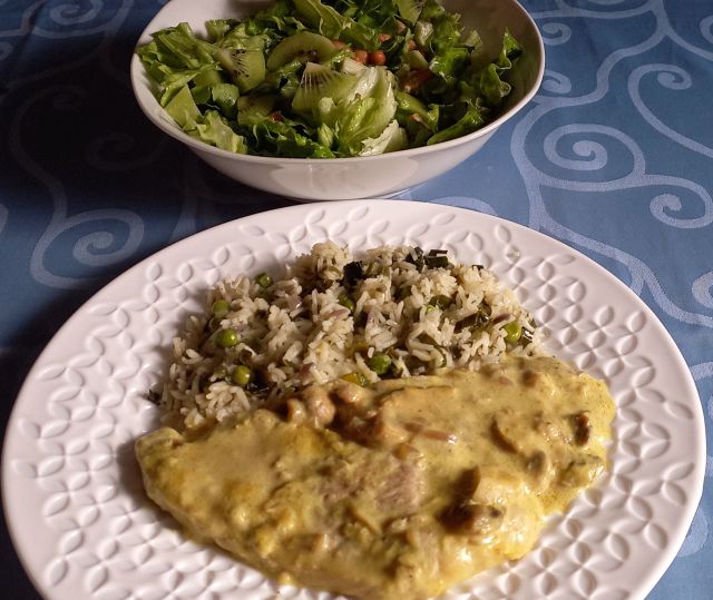 Sv.zrezek v jurčkovi omaki, rizi-bizi (por in grah); zelena solata s fižolom in kivijem