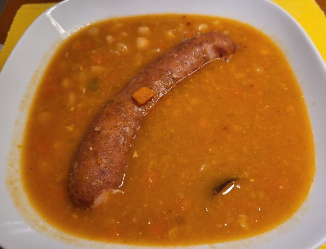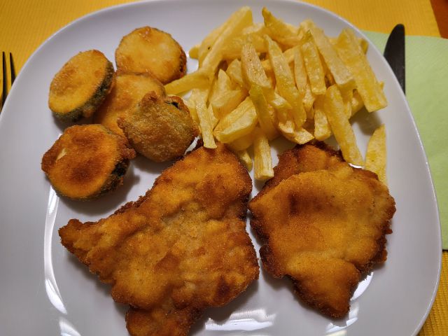 Včeraj pasulj s klobaso, za sina preostanek mesa po dunajsko, bučke, pomfrit, solata