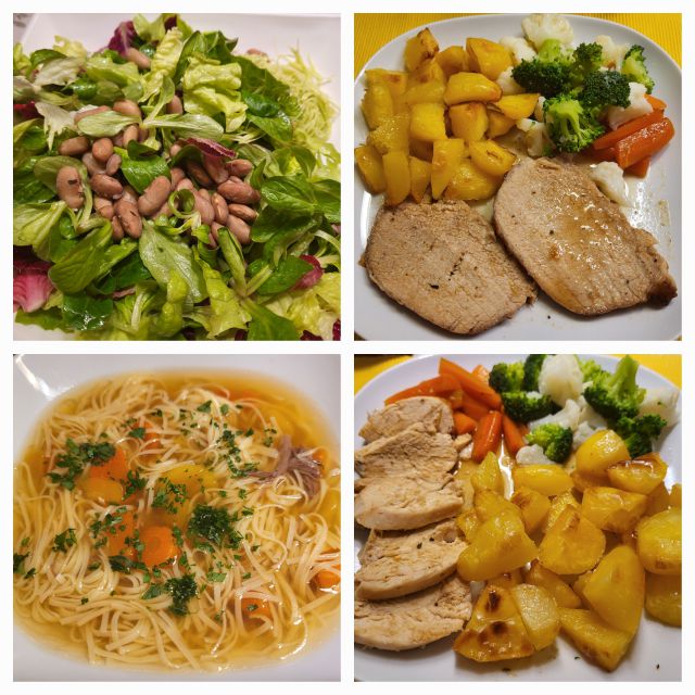 Danes goveja juha z domačimi rezanci, pečena piščančja prsa in svinjski kare, pečen krompir, zelenjava, solata