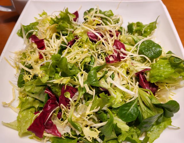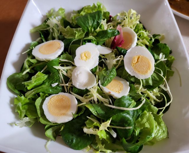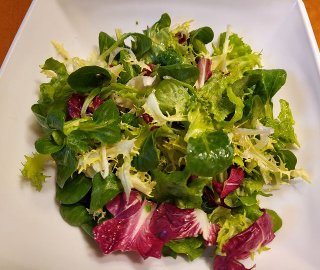 Nedelja: goveja juha z rezanci, pražen krompir, pečene perutničke, endivija in rdeč radič v solati s krompirjem in jajci.