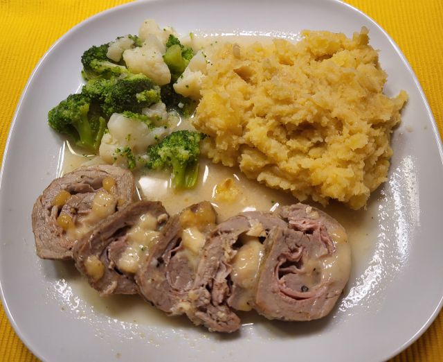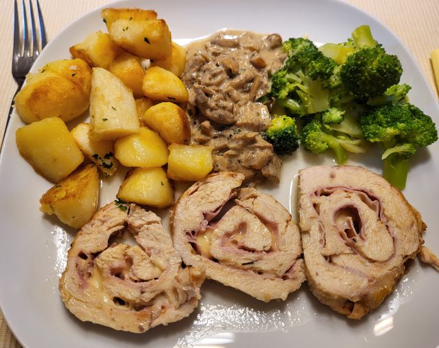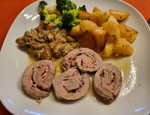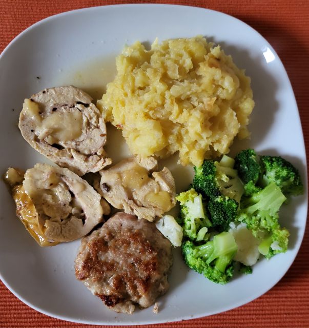 Danes goveja juha iz zaloge z rezanci, mesni ruladi ( sv.ribica in piščančja s sirom in pršutom), zelenjava, omaka iz jurčkov, pečen krompir, mešana solata, čokoladna torta