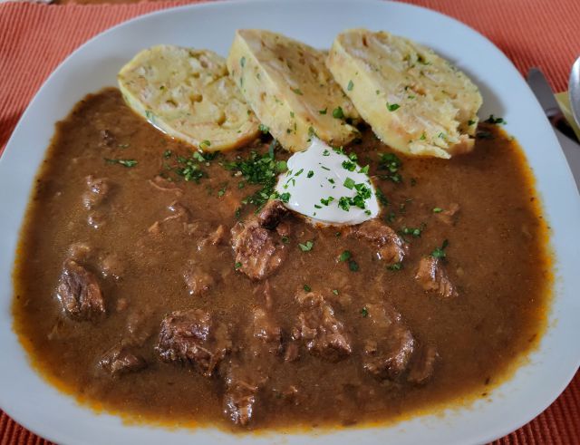 Danes goveji golaž iz zaloge, kruhova štruca, solata