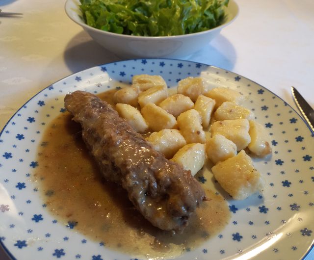 Goveja juhica z rezanci; goveji zvitek s pršutom in sirom, njoki; zelena solata