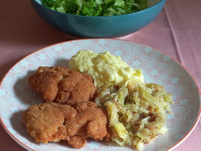 Pire krompir, dušeno sladko zelje, paniran piščanec; zelena solata ; skutni štrudelj
