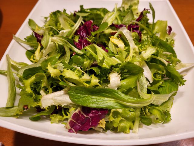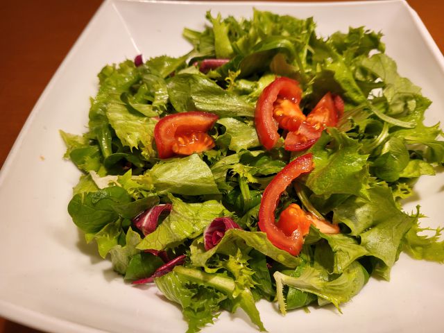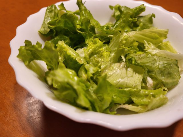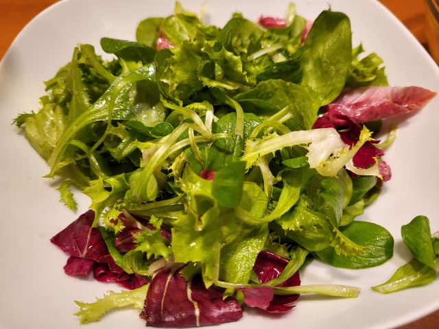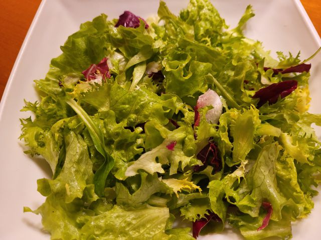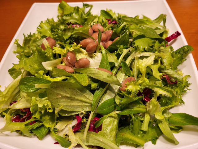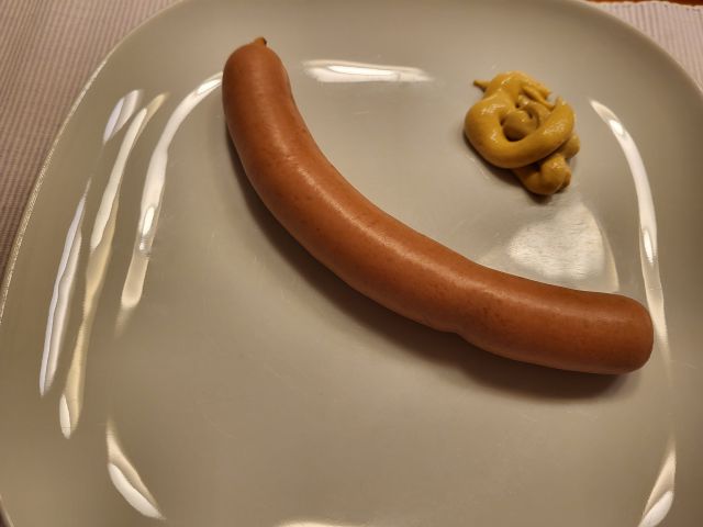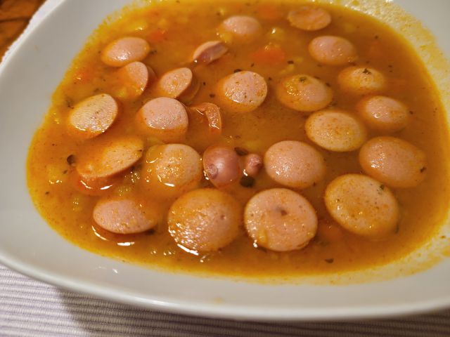 Mož hrenovko, fižolovo solato, kruh, sin torteline s sirovo omako, solato, jaz obogateno kurjo juho