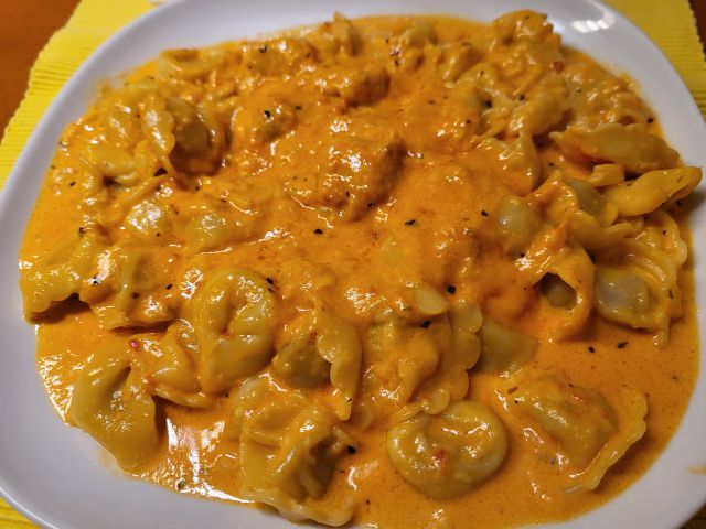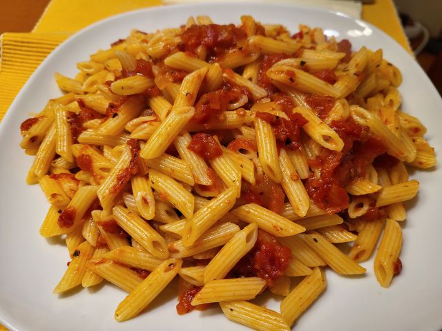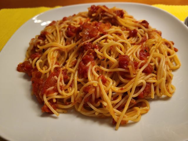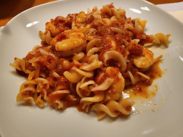 13.12.25 domača paradižnikova omaka s čilijem za moža in sina s špageti in peresniki, zame z gamberi in brezglutenskimi testeninami, solata