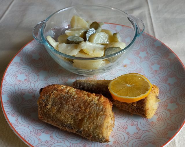 Včeraj juha iz krompirja in stročjega fižola,pečena vratovina v omaki, svaljki, solata, sadni smuti