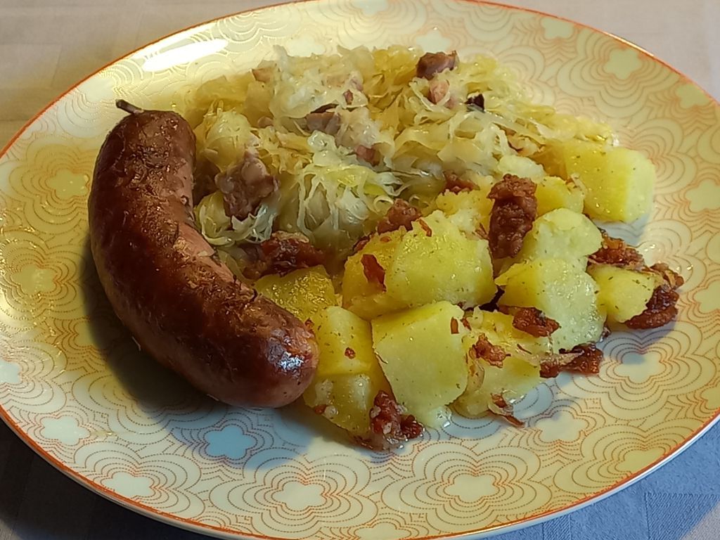 Dušeno kislo zelje, z ocvirki in čebulo zabeljen krompir, suha klobasa