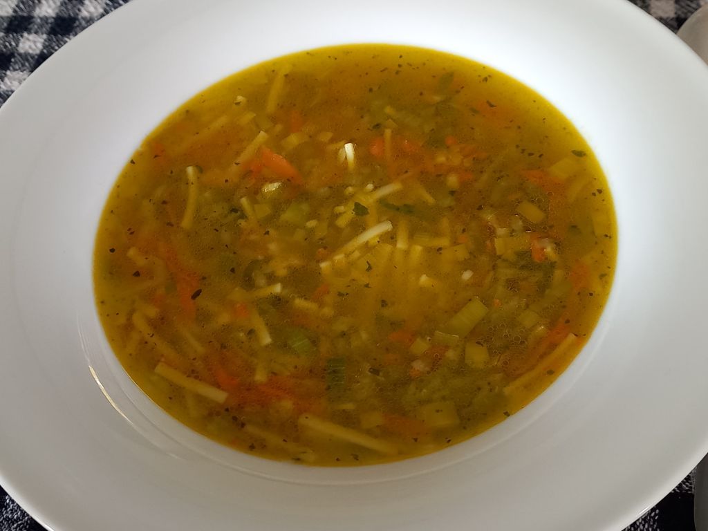 Zelenjavna juhica; zeleni njoki, meso s čebulo in papriko; zelena solata