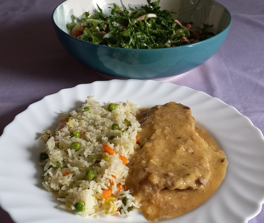 Goveji zrezki v naravni omaki, rizi-bizi; regrat s krompirjem in fižolom