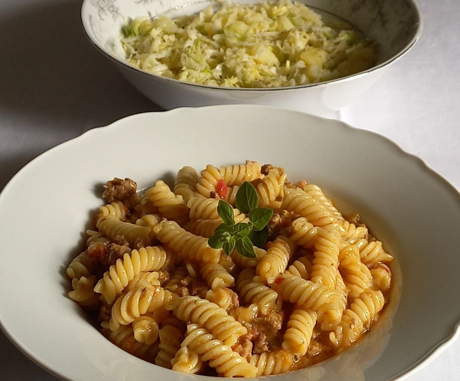 Zelenjavna juhica; kozice v omaki pesto genoveze, veliko česna, vse na širokih rezancih; zelena solata z zeljem