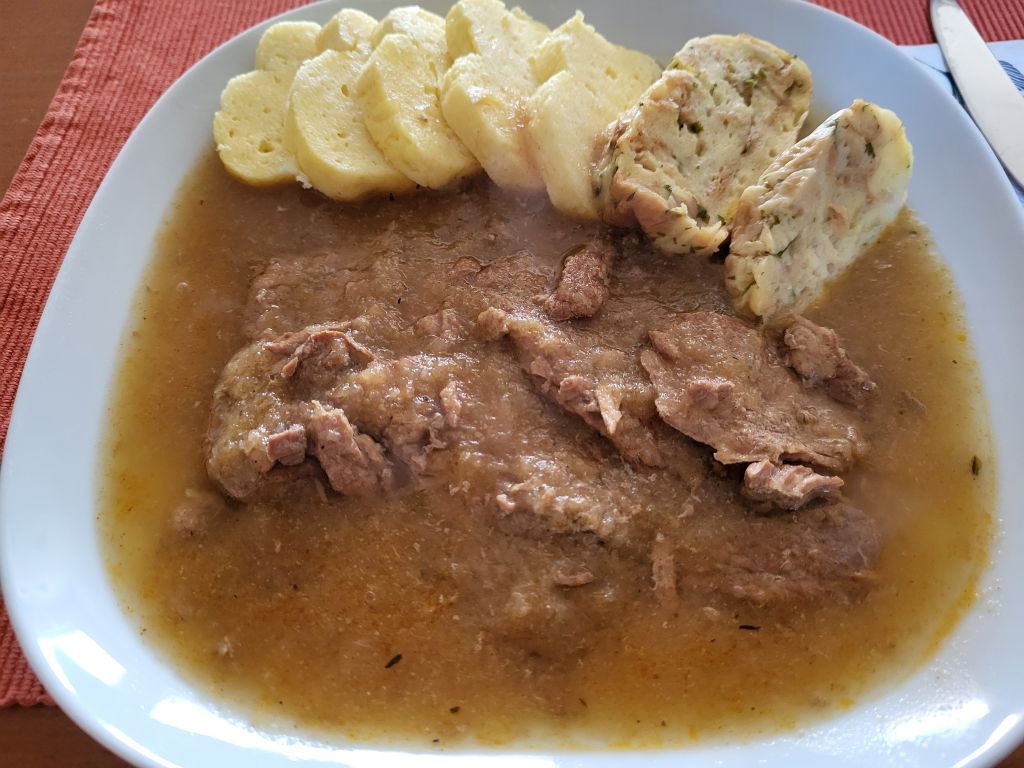 7.4 telečji zrezki v omaki, zdrobov - skutni in kruhov štrukelj, solata