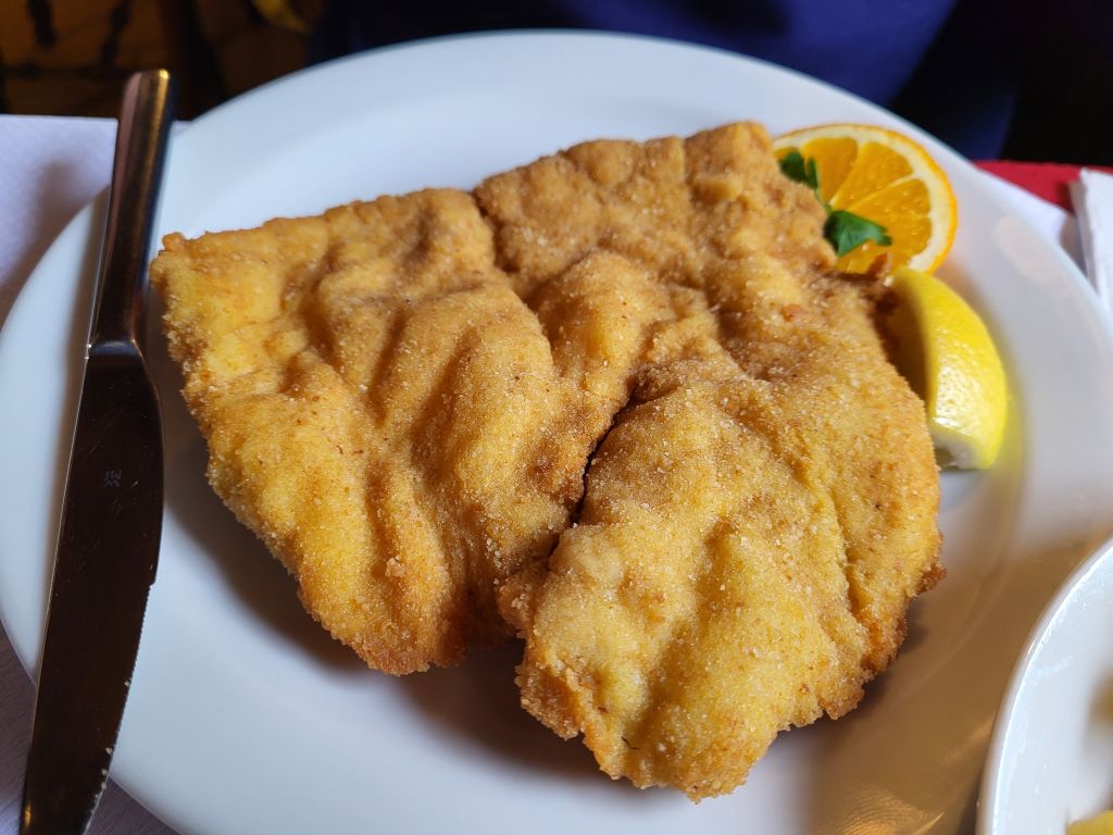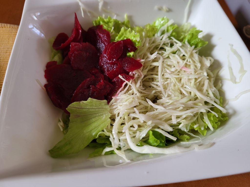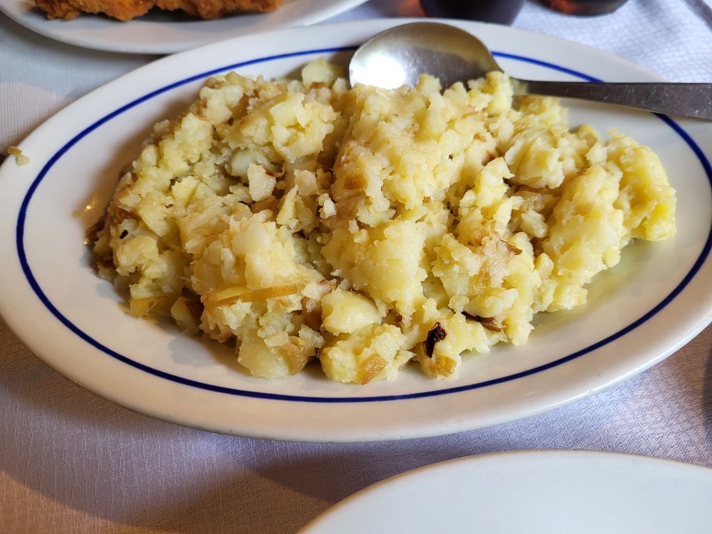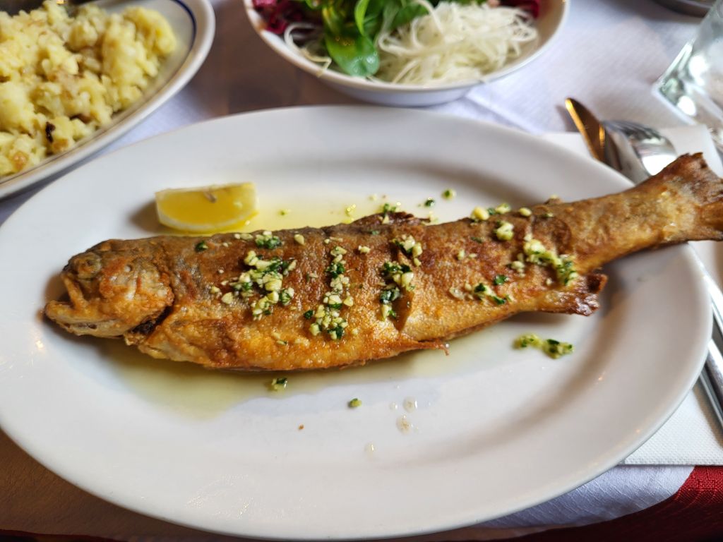 V nedeljo pa po dolgem času v meni ljubo gostilno na postrv, moja dva dunajca, pomfri, pražen krompir, solata...