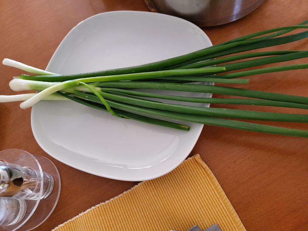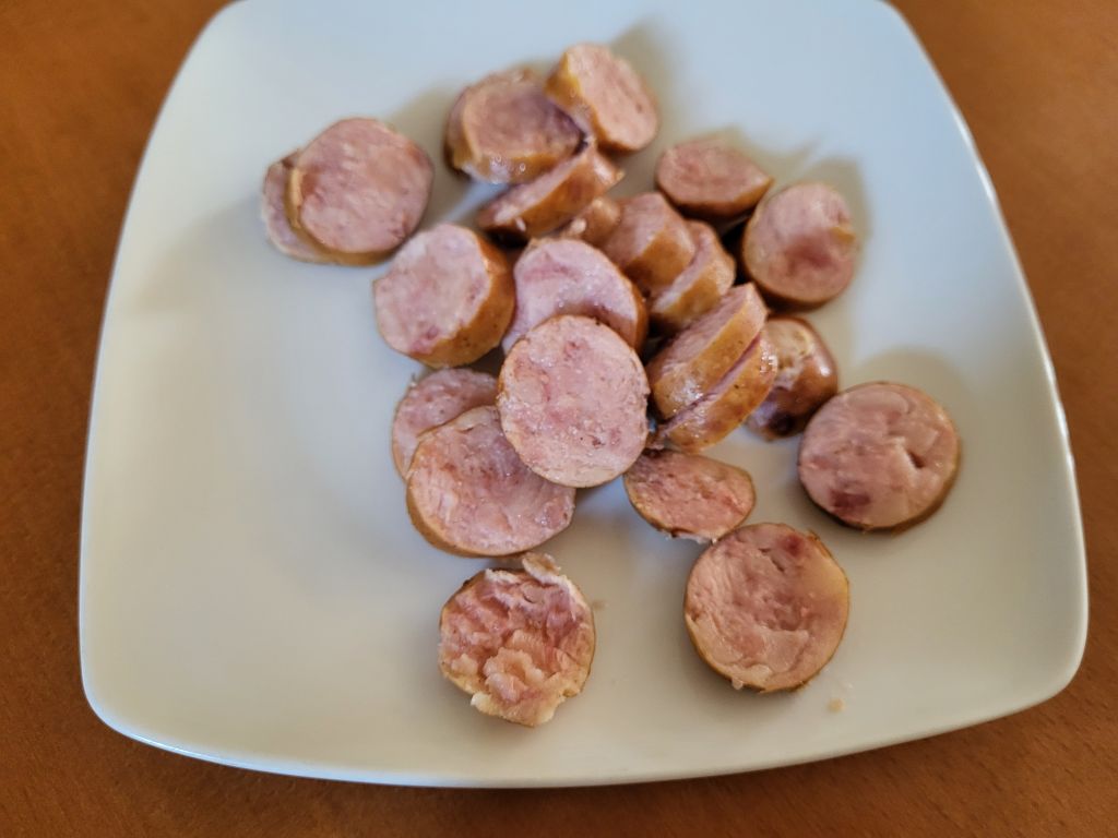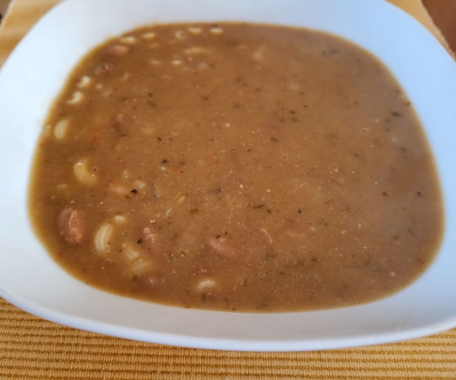 Včeraj fižolova mineštra, domača čebula, kranjska klobasa, kruh