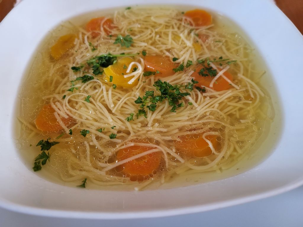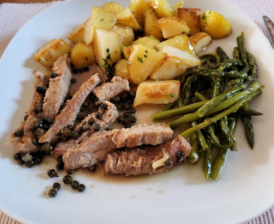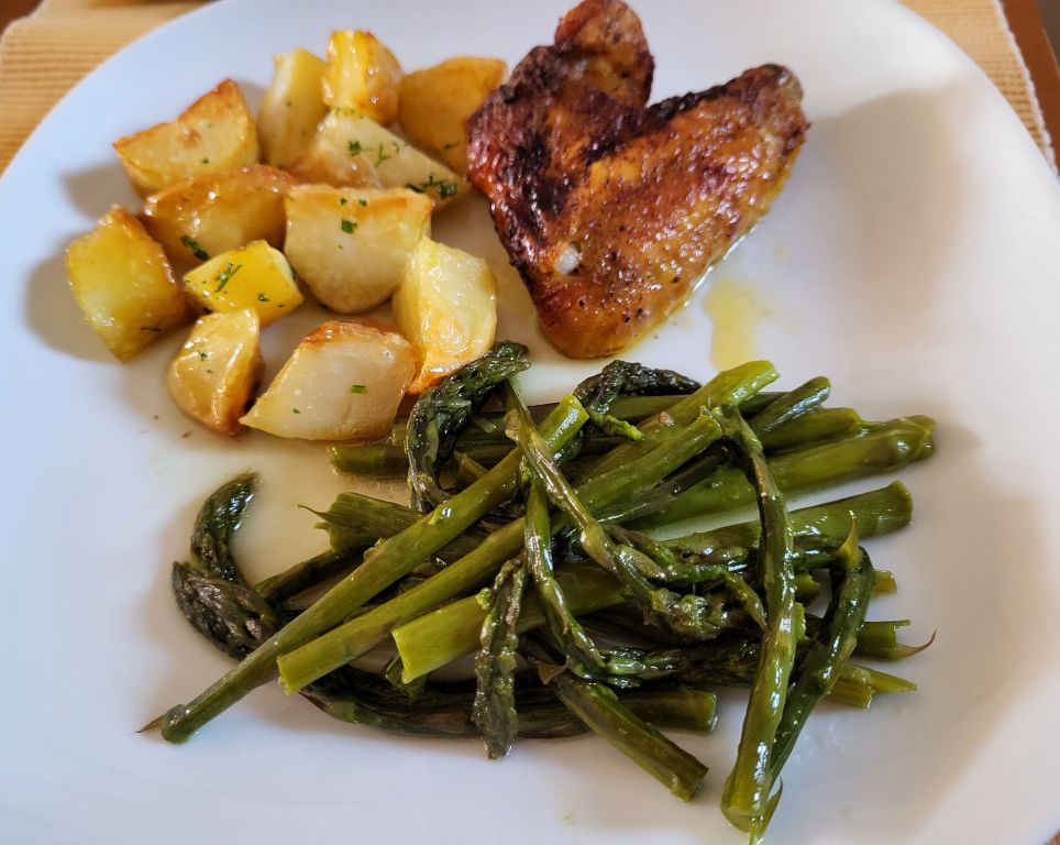 Danes goveja juha z rezanci, mlad pečen krompir, teletina z zelenim poprom, piščančje peruti, šparglji, solata
