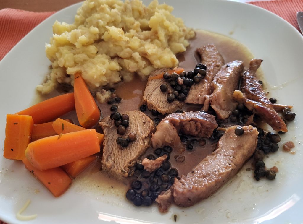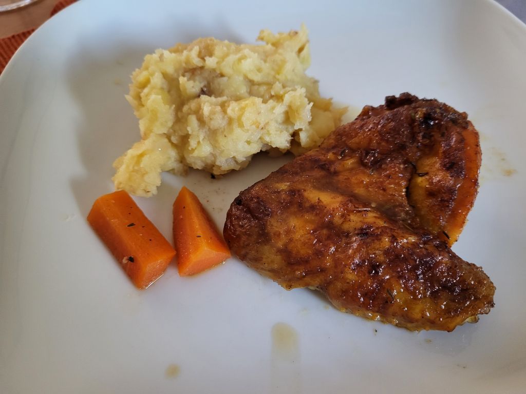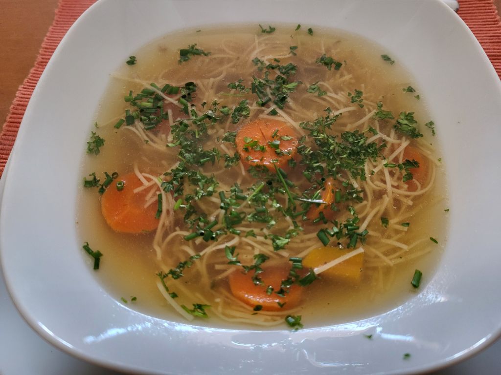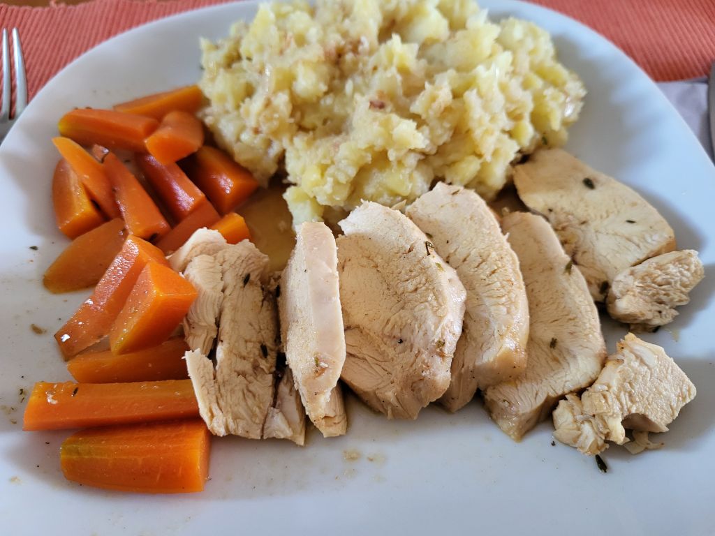 Goveja juha z rezanci, za moža ostanek telečje pečenke z zelenim poprom, zame pečena perutnička, za sina piščančja prsa, pražen krompir, solata.