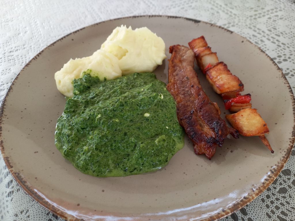 Špinača, pire krompir, sv.nabodala, carsko meso; zelena solata