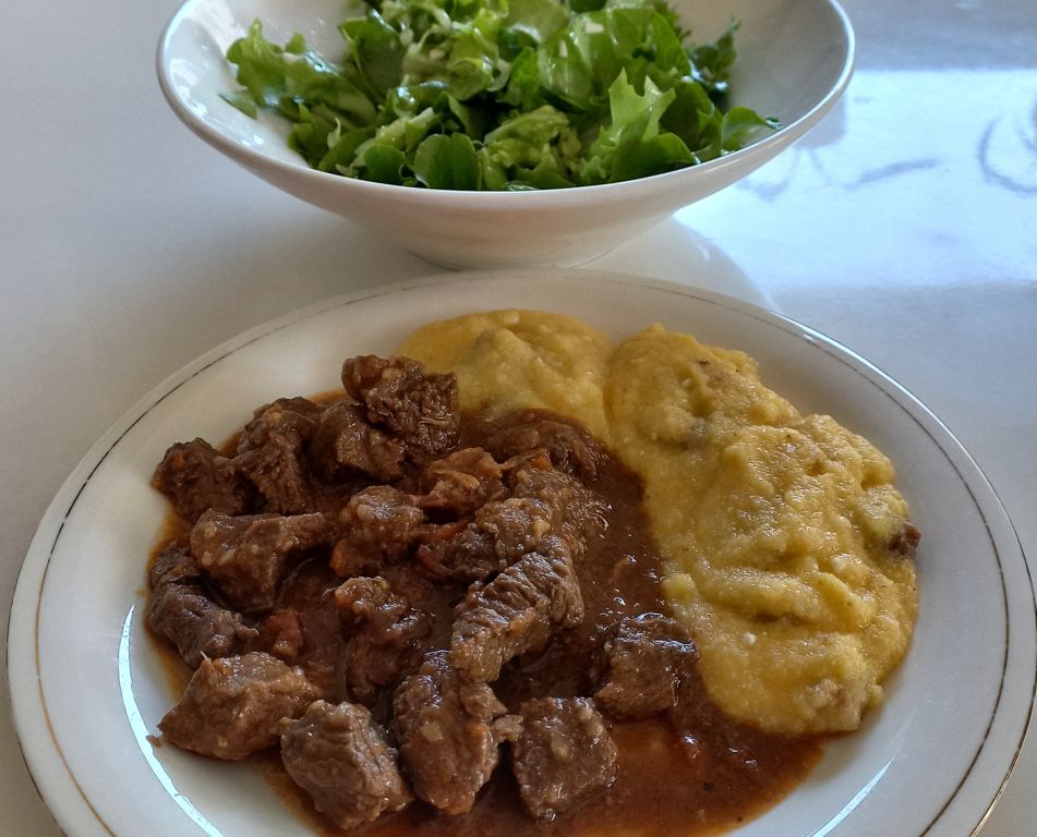 Goveji golaž (od včeraj), polenta z ocvirki; zelena solata z zeljem