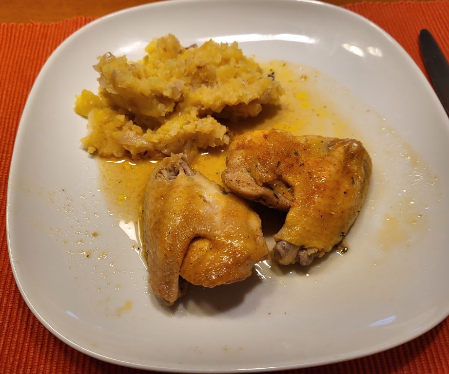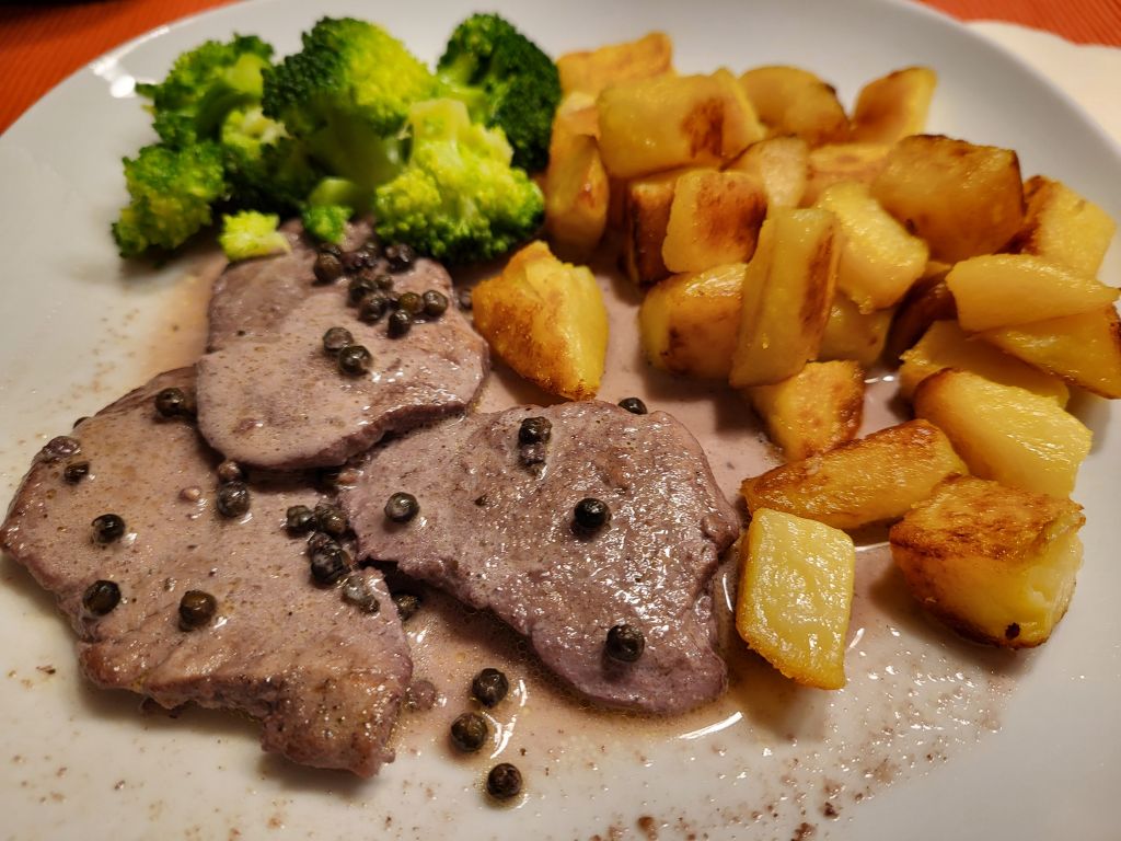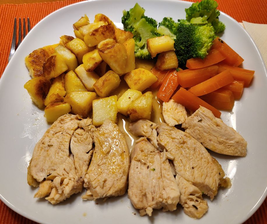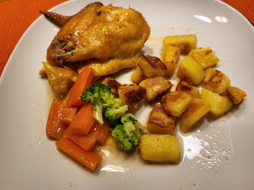 25.1. pečen piščanec, krompir, sv.ribica z zelenim poprom v omaki, zelenjava, solata