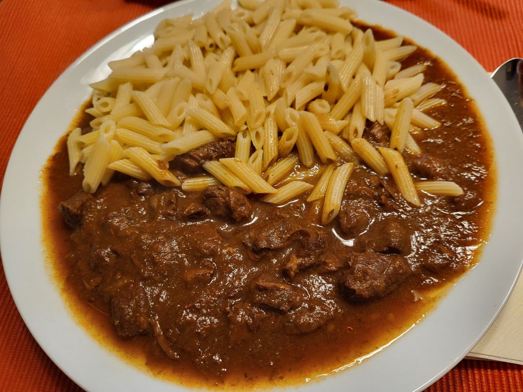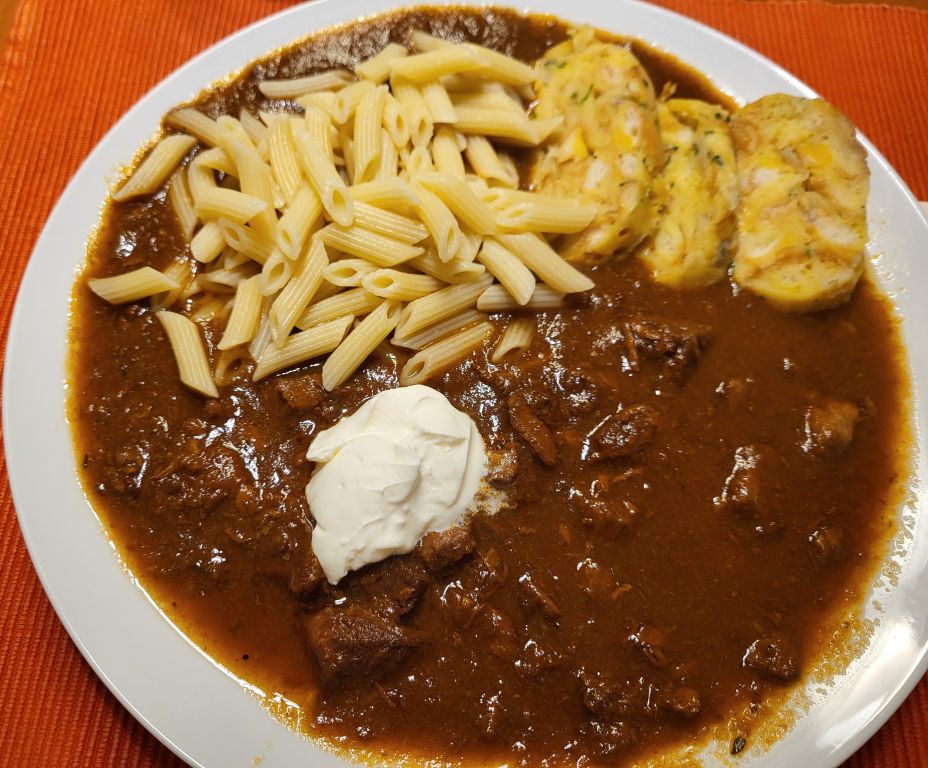 26.1 ostanek golaža, testenine, kruhove rezine, solata