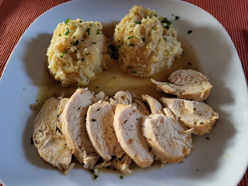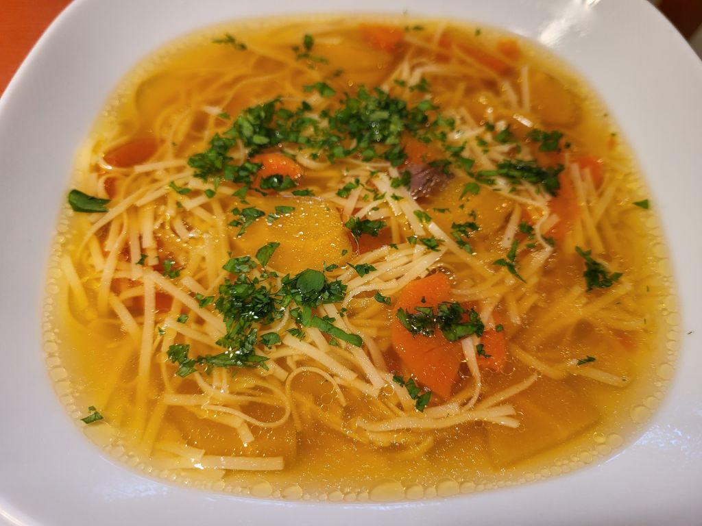 2.2 goveja juha z rezanci, telečja pečenka, piščanec, pražen krompir, solata