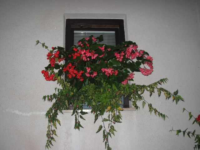 Na oknu pa pelargonija z pisanimi listi in takimi navadnimi cvetovi, listi so bili zelo lepi