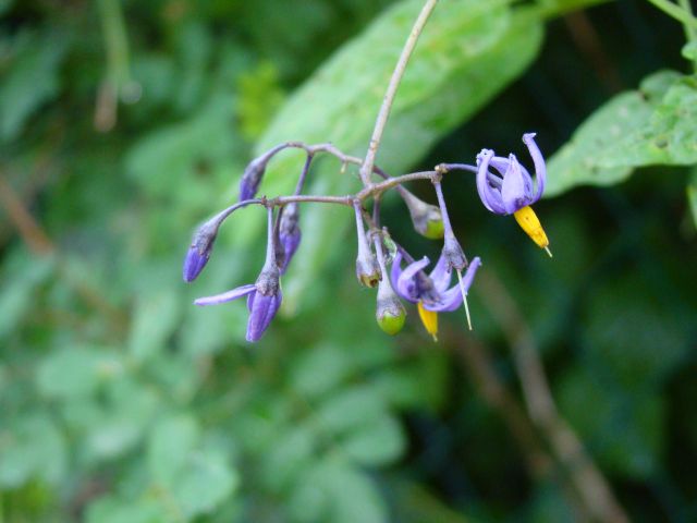 1. Grenkoslad (Solanum dulcamara), divji sorodnik paradižnika, na sliki se vidijo cvetovi in en majhen nastavek za plod, ki bo kasneje zrasel v centimeter velik paradižniček.