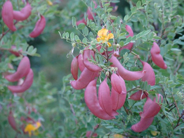 Prva uganka: grm z listi, podobnimi akaciji, cveti rumeno (en cvet je še na sliki), plodovi v obliki bledo škrlatnih napihnjenih strokov, ki kasneje začnejo rjaveti. Seme še ni zrelo. Hipoteza: nimam pojma, najbrž sodi med sorodnice akacije.