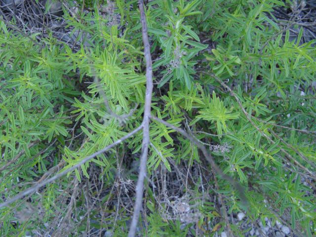 Druga uganka: nizek grmiček, po listih malo podoben šatraju, ki po vsej okolici razširja omamen vonj po limonah. Na sliki se nekoliko vidi lanska soplodja, letos še ne cveti. Hipoteza: kolikor sem gledala, bi bila lahko citronska monarda (Monarda citriodora), ampak nisem vedela, da to raste pri nas divje.