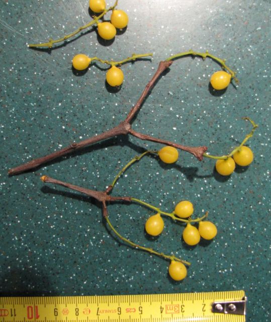 Pred kratkim smo podrli hrast, na katerem je rastla rastlina zajedalka. Ni imela listov, imela pa je te rumene plodove. Ima "krhke" vejice, saj so se z lahkoto lomile. Ima grmičasto obliko in sem najprej pomislila na podobno belo omelo.