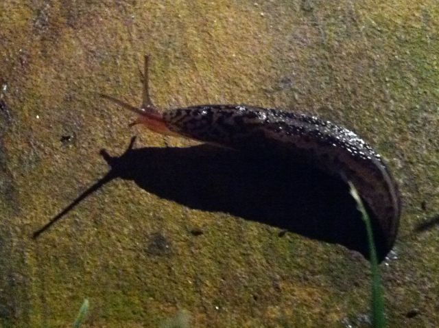 Evo ga, "slug" (polž brez hišice), šeta po mojem vrtu. Upam, da ga bo katera od mojih ptic pozobala. :)