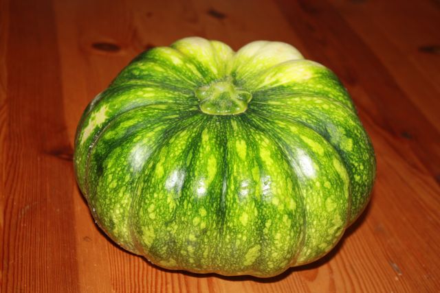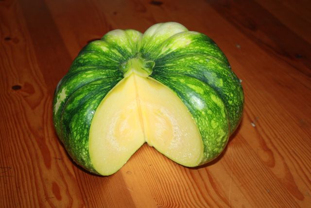 Tole je zraslo iz sadike, ki sem jo kupila pod imenom 'bučka'. Ker je meso mehko in zeleno, sklepam, da je v žlahti s cukiniji in ne z jedilnimi bučami, huh? Upam, da je jedilna (se bom držala rimljankinega nasveta o grenkobi).