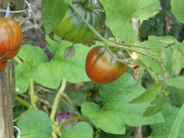 polarbearNak, tisti na fotki je OSU Blue, ki je modrovijoličen, dokler ni zrel, bolj je na soncu, bolj v črno vleče, če je v senci je res kot indigo. In ko zori, je vidno rdečkast, ko na otip postane malo mehkejši kot je povsem nezrel, je čas za bero. Je pa stvar okusa, kdaj je nek paradižnik za nekoga zrel. Zleo atraktiven je, moram reči, celo lsitje ima črne predele in rado se zvija. Idelano, da ti ga kak kolega oceni za bolnega. ![]()