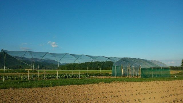Letos imamo narejeno tako kot je na spodnji sliki. Tam kjer je posajen paradižnik (6 x 5 m) imamo po vrhu lokov UV folijo, ki smo jo pokrili s protitočno mrežo (del je na sliki še ni). Ostali del vrtnin pa je pokrit le s protitočno mrežo, ki je odlična tudi za senčenje.