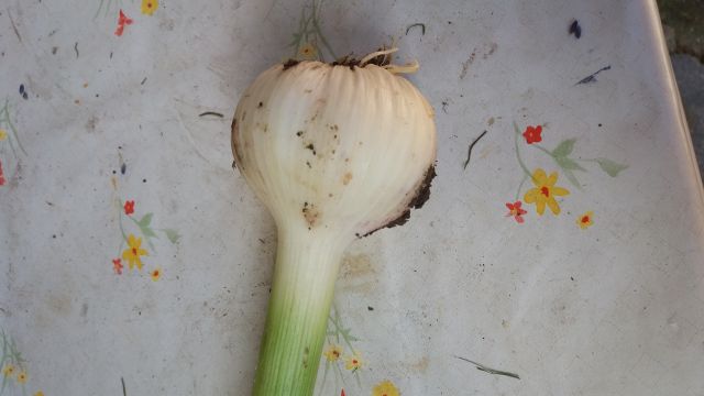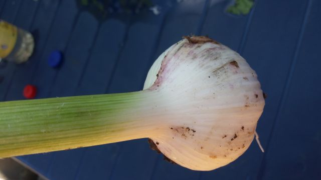 Porežemo česnu in tudi čebuli tudi mi nastavke cvetov, ker gre sicer energija v cvet namesto da bi debelil čebulo - tako so me naučili, Trenutno imam belo čebulu, ki ima sicer lepe debele čebule, vendar še zelo zeleno steblo, tako da jo je še za pusti. Česen, ki je pred kakšnimi desetimi dnevi začel rumeneti , vendar steblo ni še povsem suho. Če ga želimo spuliti se največkrat gornji del odtrže in izgleda, da ga bomo morali konkretno izkopati. Oboje je bilo sajeno jeseni.