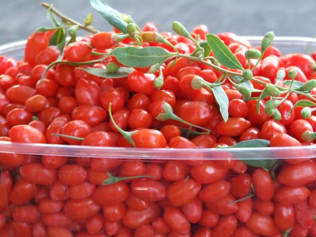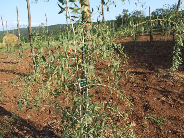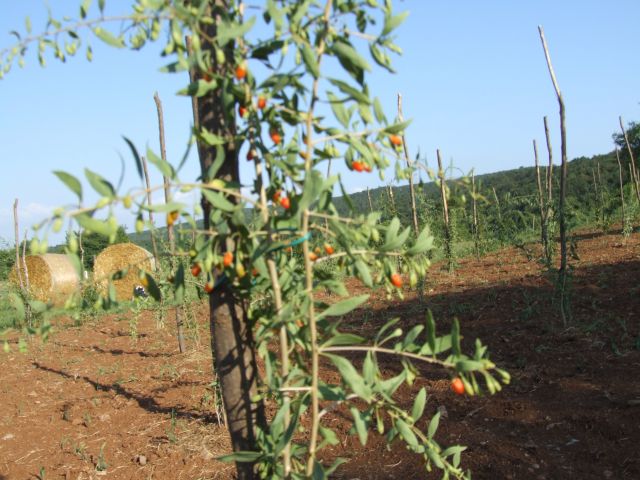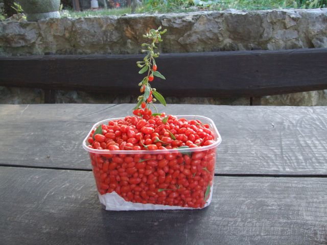 Prilagam tudi nekaj fotk. Rastline so bile posajene konec marca 2012, slikice pa so od 13.julija istega leta istega leta. Ko sem jih posadil, so bile sadike visoke 10cm. Sadike so pravi Lycim Barbarum in NE Lycium Chinense, ki prihaja, kot že omenjeno" iz Nizozemske. Delam na tem, da ljudje spoznajo razliko, ki je ogromna. Sadeži na sliki so izjemno dobrega in sladkega okusa, čaj iz lističev pa vrhunski.