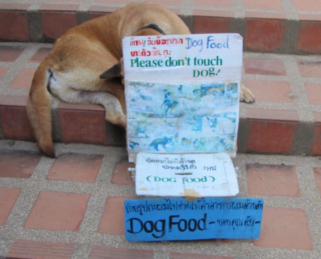 Takole prosi kuža za "denar za hrano" na stopnicah enega večjih templjev na Tajski.