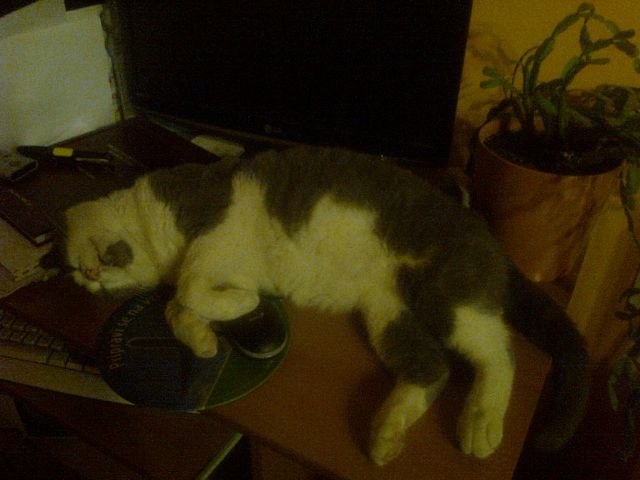 Vau, kaki mačkon, Miško se je vlegel na miško, da mu ne bi zbežala.Je pa pravi računalniški mačkon, tudi njemu ni napredna tehnologija neznanka