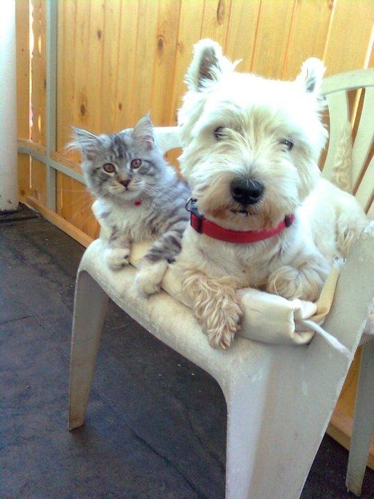 Tole sta pa naša dva kosmatinčka.. Mamina mucka Aiša, pasme Maine Coon (največji maček na svetu, ki tehta 12 kg) in bo kmalu večja od sestrinega višavskega terierja Cezarja. Se pa super razumeta - igrata in spita "objeta". :)