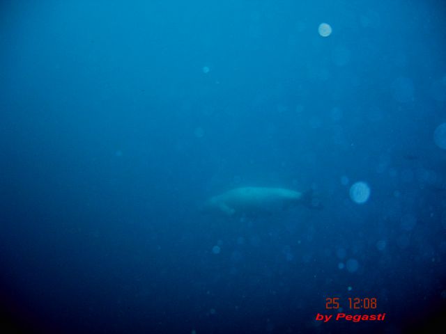 Tole je morska medvedka (Monachus monachus), slikana v vodah tam okoli Kamenjaka. Slikala nisem jaz, če bi, bi bila slika veliko boljša (upam, da mi ne verjamete - fotografu sem zelooooo hvaležna, da se je sploh zrajtal, dvigniti fotoaparat k očesu, ali bolje, k maski in škljocniti - če bi bila jaz na njegovem mestu, je vprašanje, če bi se sploh spomnila, da držim fotoaparat v rokah