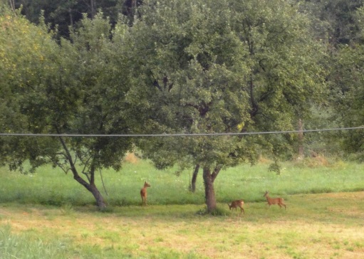 Le streljaj od našega doma se večkrat pase mama srna z dvema otročkoma.