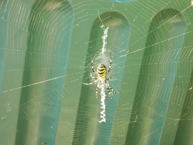 Gospa si je naredila mrežo na idealnem mestu - pred kompostnikom, kjer je polno mušic. Ne vem pa, kdaj bomo kompostnik spet lahko odprli, meni je namreč škoda raztrgati tako lepo mrežo. Pajklja pa je res ogromna, telo meri okrog 2cm.