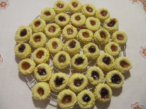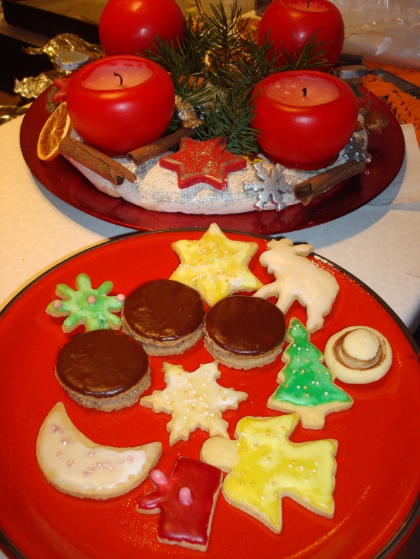 pri nas tudi lepo diši po piškotih. skupaj s hčerama (11 in 14 let), ob moralni podpori moža jasno, smo že spekle - ne pa dokončno okrasile (to bomo delale ta vikend): moji mehki medenjaki, kokosove solze, preprosti piškoti, klobčiči, istrski cukarini, mehki cimetovi keksi, ježki, orehovi rogljički, razpokani piškoti (vse iz baze) + marelični obročki z mandlji, krapki z orehi.